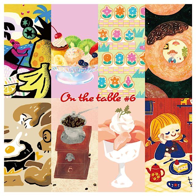 「on the table #6」テーブルの上にあるのは、プリンアラモードや桃のパフェ、夜空に浮かぶドーナッツ。