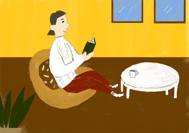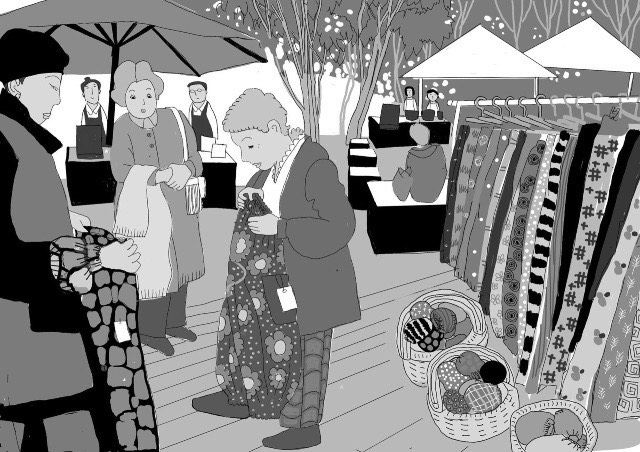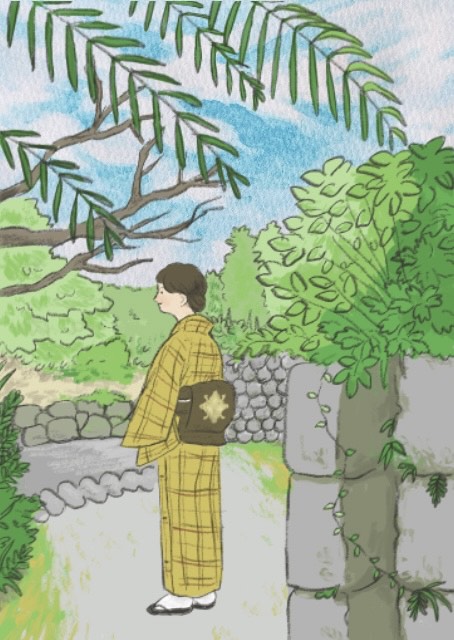 八丈島の風景や伝統的な着物(黄八丈)を描きました。