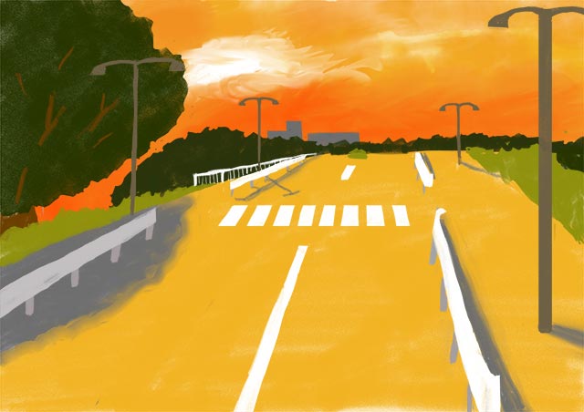 夕焼けに照らされた道路と夕焼け空を描きたくて描きましたが、道路と空が同じ色だと夕焼けが目立たないと指摘を受け、