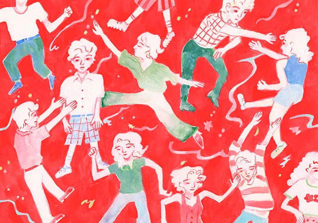 参加したグループ展のテーマだったので踊る人を描きました。パーティーっぽく楽しさも意識しました。