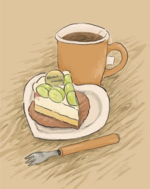 秋の季節限定のスイーツを描きました。近所のケーキ屋さんのシャインマスカットケーキと