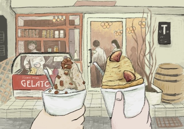 箱根湯本のジェラート屋さんのジェラートを描きました。卓上の食べ物を描く人が本当に多い…