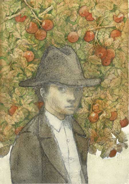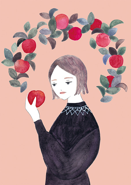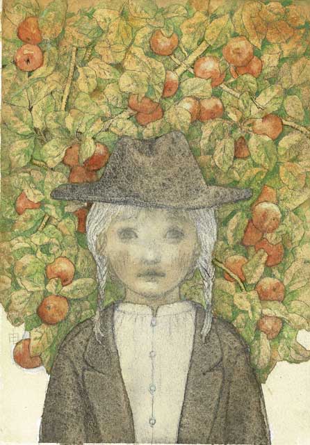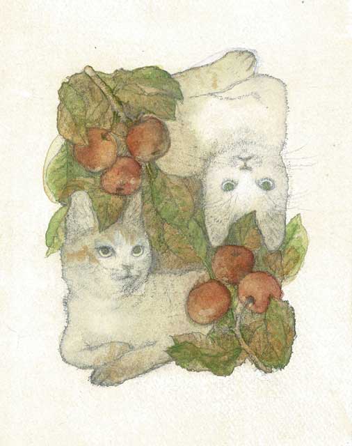 林檎の木を背景に人物と猫を描きました。講習では色が黄色一色の背景で林檎に見えなかった為、