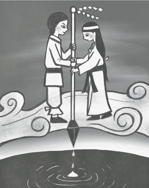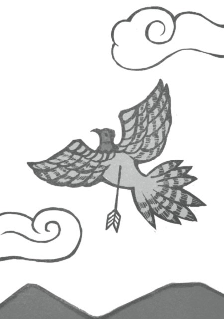 2枚目は天照大神が送った雉を息子の神様が弓矢で射るシーン、